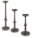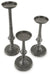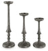 Details Set of 3, Made with cast aluminum, Antiqued pewter-tone finish, Each holds a 3” pillar candle (candles not included), Due to the finishing process of this product, some variations may occur