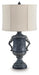 Details Made of polyresin with drum bell fabric shade, Antiqued black finish, 3-way switch, 1 E26 socket, type A bulb recommended (not included); 150 watts max or LED equivalent; UL Listed, Minor assembly required; simply attach preassembled shade to lamp base