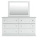 | Details | B139B43: Includes panel headboard/footboard and rails, Made with engineered wood (MDF/particleboard/plywood) and decorative laminate for the right balance of affordability and durability, Replicated solid white paint, Decorative laminate replicates natural or man-made material surfaces with consistent color, pattern and texture, Foundation/box spring required, sold separately, Mattress available, sold separately, Assembly required, B139B40: Includes dresser and mirror, Made of engineered wood (MDF/particleboard), Knobs with pewter-tone finish, Scalloped moulding, 6 smooth-operating drawers, Includes tipover restraint device, Mirror attaches to back of dresser; can also be mounted on wall horizontally or vertically, Safety is a top priority, clothing storage units are designed to meet the most current standard for stability, ASTM F 2057 (ASTM International), Drawers extend out to accommodate maximum access to drawer interior while maintaining safety, | |