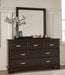 | Details | B441B6: Includes panel headboard, footboard, rails and slats, Made with hardwood solids, engineered wood veneer and MDF substrates, Dark brown finish, Floating panel headboard, Picture frame footboard, Foundation/box spring required, sold separately , Mattress available, sold separately, Assembly required, B441B1: Includes dresser and mirror, Made with hardwood solids, engineered wood veneer and MDF substrates, Dark brown finish, Metal bar pulls with bright nickel-tone finish, 7 smooth-gliding drawers with dovetail construction and metal center guides, Drawer interiors are lined with a wood grain laminate for a clean, finished look, Top moulding on dresser, Mirror attaches to back of dresser, B441-46: Made with hardwood solids, engineered wood veneer and MDF substrates, Dark brown finish, Metal bar pulls with bright nickel-tone finish, 5 smooth-gliding drawers with dovetail construction and metal center guides, Drawer interiors are lined with a wood grain laminate for a clean, finished look, Top moulding, B441-92: Made with hardwood solids, engineered wood veneer and MDF substrates, Dark brown finish, Metal bar pulls with bright nickel-tone finish, 2 smooth-gliding drawers with dovetail construction and metal center guides, Drawer interiors are lined with a wood grain laminate for a clean, finished look, Top moulding, | |