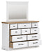 | Details | B844B2: Includes panel headboard, storage footboard, rails and roll slats, Footboard made with hardwood solids, MDF substrates and butcher block oak veneer, Headboard and rails made with hardwood solids and MDF substrates, White finish, Headboard with inset black metal barn sash, 2 drawers in footboard with fully finished interior, dovetail construction and ball-bearing side glides, Pulls with matte black finish, Bed does not require a foundation/box spring, Mattress available, sold separately, Assembly required, B844B1: Includes dresser and mirror, Made with hardwood solids, MDF substrates and butcher block oak veneer, Dresser with 2-tone finish (white finish; butcher block oak veneer with natural finish), Pulls with matte black finish, 10 spacious drawers with fully finished interiors (top drawers felt lined), dovetail construction and ball-bearing side glides , Drawers with inset picture fronts, Mirror attaches to back of dresser, | |