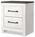 Cool, clean and casually modern. This nightstand's wispy whitewash and gray finish sets the tone for your calming sanctuary. Large linear pulls add dimension and authenticity. Two smooth-gliding drawers neatly accommodate your bedside needs.