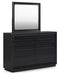 | Details | B768B5: Includes headboard, footboard and rails, Made with pine solids, veneers and engineered wood substrate, Textured black wood stain with waxy topcoat, Extra wide rails for a bench-like wrap around, Foundation/box spring required, sold separately, Mattress available, sold separately, Assembly required, B768B1: Includes dresser and mirror, Made with pine solids, veneers and engineered wood substrate, Textured black wood stain with waxy topcoat, Hardware-less design, 6 drawers with fully finished interiors, dovetail construction and ball-bearing side glides (top drawers felt lined), Mirror attaches to back of dresser, | |