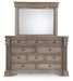 | Details | B916B2: Includes panel headboard, footboard with slats and rails, Made with hardwood solids, oak and ash veneer, cast resin components and engineered wood substrates, Tops with inlaid ash veneer border, Light warm grayish brown glazed wood finish, Breakfront pilasters, Inset picture frame panels, Headboard features light bridge with 2 overhead LED lights, Foundation/box spring required, sold separately , Mattress available, sold separately, Assembly required, B916B1: Includes dresser and mirror, Made with hardwood solids, oak and ash veneer, cast resin components and engineered wood substrates, Tops with inlaid ash veneer border, Light warm grayish brown glazed wood finish, Round metal knobs with satin nickel-tone finish, 10 drawers with fully finished interior, dovetail construction and ball-bearing side glides, Drawers with inset framed fronts, Dresser with breakfront pilasters, Mirror frame features light bridge with 2 mini LED lights, Mirror attaches to back of dresser, | |