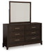 | Details | B618B2: Includes upholstered panel headboard, panel rails and panel footboard with slats, Made with hardwood solids, engineered wood and MDF substrates, Grayish brown wood-tone finish, Floating inset upholstered panel in polyester Next-Gen Nuvella fabric surrounded by LED backlight, Next-Gen Nuvella™ is a performance fabric that is soft, easy to clean, stain-resistant and durable, Clean fabric with mild soap and water, let air dry; for stubborn stains, use a solution of 4 oz. bleach to 28 oz. water, Light switch is located on each side of headboard and includes dual USB charging port (USB-A and USB-C), Power cord included; UL Listed, Foundation/box spring required, sold separately, Mattress available, sold separately, Assembly required, B618B1: Includes dresser and mirror, Made with hardwood solids, engineered wood and MDF substrates, Grayish brown wood-tone finish, Metal bar pulls with satin nickel-tone finish, 6 smooth-gliding drawers with dovetail construction and heavy duty ball-bearing side glides (top drawers felt lined), Mirror attaches to back of dresser, B618-92: Made with hardwood solids, engineered wood and MDF substrates, Grayish brown wood-tone finish, Metal bar pulls with satin nickel-tone finish, 2 smooth-gliding drawers with dovetail construction and heavy duty ball-bearing side glides (top drawers felt lined), | |