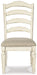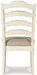 Details D743-45: Made of veneers, wood and engineered wood with some cast resin components, Antiqued two-tone finish, Separate extension leaf, Table extends by pulling both ends and dropping in leaf, Seats up to 8, Assembly required, D743-01: Made with wood and engineered wood, Distressed, chipped white finish, Ladderback styling, Polyester upholstery over foam cushioned seat, Assembly required, D743-02: Made with wood and engineered wood, Distressed, chipped white finish, Stylized ribbon back design, Polyester upholstery over foam cushioned seat, Assembly required,
