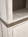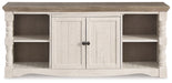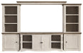 Details Includes TV stand, 2 pier cabinets and bridge, Made of pine wood, pine veneer and engineered wood , Two-tone distressed finish: weathered gray top; vintage white base, TV stand with 2-door cabinet with single-shelf storage and 2 open shelves, Each pier cabinet with 2 fixed shelves and cabinet with single-shelf storage, Aged iron-color hardware, Cutouts for wire management, Assembly required
