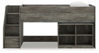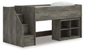 Details Includes loft bed, left storage steps with loft ends, roll slats and loft bookcase, Made with engineered wood (MDF/particleboard/plywood) and decorative laminate for the right balance of affordability and durability, Rustic warm gray finish over replicated oak grain with authentic touch, Decorative laminate replicates natural or man-made material surfaces with consistent color, pattern and texture, 4 storage cubbies, Bed does not require additional foundation/box spring, Mattress available, sold separately, Assembly required