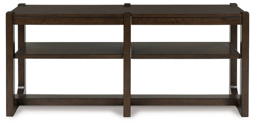 Signature Design by Ashley®Master the art of casual contemporary design with the Korestone sofa table. Its softly rounded wood frame top pairs perfectly with an eye-catching ...