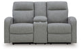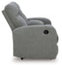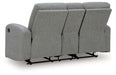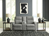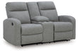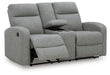 Details Dual-sided recliner; middle seat remains stationary, Pull tab reclining motion, Corner-blocked frame with metal reinforced seat, Attached cushions, High-quality foam cushions wrapped in poly fiber, Polyester upholstery, Center console with 2 cup holders and hidden storage