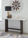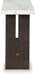 Dressed to thrill, this simply stunning sofa table offers a high-design look at a down-to-earth price. Ultra-sleek lines are accentuated with a dark waxy brown oak finish that’s so easy on the eyes. Clean-lined and modern, the plinth base and natural marble tabletop showcase quality craftsmanship and attention to detail. This table is the perfect sofa companion for a living room or family space, with a timeless look that's made to last.