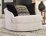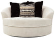 Let it snow. Doubling your pleasure with a spacious seating area with room for two—or just you—this oversized round swivel chair in a snow-tone neutral invites you to stretch your style in an easy-elegant way. Whether your aesthetic is urban hip or suburban chic, this posh swivel chair is sure to look and feel right at home. Wrapped in a chunky heavyweight chenille fabric with a delightful touch, this fashion-forward chair includes designer pillows for a brilliant pop of color and texture.