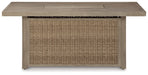 | Details | Gas fire pit table with CSA-approved 30,000 BTU stainless steel burner, glass beads, burner cover and all-weather protective cover, Aluminum top, All-weather resin wicker handwoven over powder coated rust-proof aluminum frame, Battery-operated ignition system with adjustable flame control; battery included, Cabinet door conceals gas propane tank (not included) and 2 shelves, Gas line or propane tank connector hose not provided, Convertible to natural gas, Assembly required | |