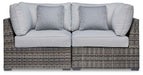 | Details | Set of 2, All-weather resin wicker handwoven over rust-free aluminum frame with durable powder coated finish, Loose, reversible cushions, Easy-clean polyester (Nuvella®) upholstery remains vibrant and resists stains, All-weather foam cushion core wrapped in soft polyester, Clean fabric with mild soap and water, let air dry; for stubborn stains, use a solution of 4 oz. bleach to 28 oz. water, 4 throw pillows included, Imported fabric and fill, Can be sold individually or with other pieces in the sectional, Stainless steel hardware, Assembly required | |