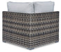 This cool, casual outdoor chair will raise the comfort level and visual appeal of your outdoor living space. Made of handwoven wicker in neutral tones of light and dark gray, the cushioned corner chair blends beautifully into your lanai or pool and patio area with thick, comfy cushions wrapped in Nuvella® high performance fabric that is stain resistant, fade resistant and easy to clean. It can be used on its own or paired with other pieces of the matching sectional to create a space that holds up to Mother Nature and ages gracefully for years of enjoyment. Four pillows are thrown in for added comfort and a splash of color.