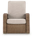 | Details | All-weather resin wicker handwoven over rust-resistant aluminum frame with durable powder coated finish, Powder coated steel recliner mechanism, Press-back reclining motion, Solution-dyed high-performance fabric, Nuvella is an outdoor fabric that can be cleaned and offers UV resistance, Clean fabric with mild soap and water, let air dry; for stubborn stains, use a solution of 4 oz. bleach to 28 oz. water, Stainless steel hardware, Designed to withstand the harsh elements of the outdoors, Assembly required | |