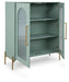 Clearly a stunning statement piece for lovers of contemporary design, this sleek accent cabinet wows on many levels. Magnificent arched fluted glass door panels and goldtone metal hardware exude serious modern flair. And how about that fresh green finish? Two shelves add practicality to the cabinet's striking style.