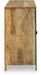 Details Made with mango wood, veneer, engineered wood and metal, Distressed light brown finish, Metal legs and door pulls with black finish, 4 doors with soft-close hinges, 2 fixed shelves, Openings in back for electronics, Minor assembly required, simply lay flat and attach feet