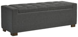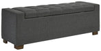 | Details | Polyester upholstery in gray, Wood legs with brown finish, Tufted seat cushion, Hinged seat, Interior storage | |