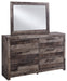 Modern yet hefty. This dresser and mirror set makes an urban eclectic statement. Seasoned raw wood look merges with the clean lined design we love today. Muted rustic finish over replicated pine grain maintains its authenticity. Roomy drawers are flanked with attractive framed front and pilasters. Handles with antiqued gunmetal finish complete this beauteous look with easy to pull function.