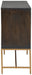This accent cabinet is a versatile stunner with 3 geometric patterned door fronts in warm dark brown accented with goldtone finish metal hardware. Standing on a goldtone metal open frame base, the three-door console is aesthetically contemporary and sophisticated, ready to serve as buffet, console or media cabinet.