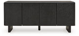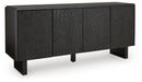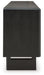 Details Made with solid wood, Black finish, Door fronts with carved pattern, 4 doors with push magnet function, 2 shelves, Openings in back for electronics, Minor assembly required; simply lay flat and attach legs