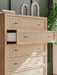 Clean-lined and contemporary—but far from stark—this bedroom package is a fresh style awakening. Pairing a light finish with replicated oak grain and textured beige details that replicate the look of cane, its mixed materials bring a naturally versatile vibe to your bedroom. Sleek, simple hardware plays perfectly with the modern aesthetic.