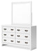 | Details | B427B8: Includes king panel headboard, footboard, rails and slats, Made with hardwood solids, okoume veneer and MDF substrates, White finish, Foundation/box spring required, sold separately, Mattress available, sold separately, Assembly required, B427B1: Includes dresser and mirror, Made with hardwood solids, okoume veneer and MDF substrates, White finish, 6 drawers with dovetail construction and metal center guides, Hardware with dark finish, Drawer interiors are lined with a wood grain laminate for a clean, finished look, Mirror attaches to back of dresser, | |