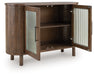 | Details | Made with solid mango wood, Back made with mango wood veneer and engineered wood substrate, Medium brown finish, Black metal door pulls, 2 doors with fluted glass inserts, 1 fixed shelf, Openings in back for electronics, Minor assembly required, simply lay flat and attach feet, Assembly required | |