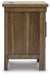 This chairside end table might appear simple at first sight. But a closer look reveals beauty in the details. With a plank-effect cabinet door, a tobacco brown finish and antiqued bronze-tone hardware, it’s simply beaming with charm. This side table's cabinet and tabletop space, along with USB charging, will serve you well for years to come.