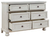 | Details | Made with wood, select oak veneer and engineered wood, Antiqued white finish with grain texture, 6 smooth-gliding drawers with dovetail construction and metal ball-bearing side glides (upper drawers with felt bottoms), Dark bronze-tone knobs | |