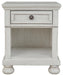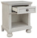 Elegant, timeless furnishings take your bedroom to the next level. Nothing does that better than this nightstand. The antiqued white finish with a wonderful grain texture radiates sophistication, while a dark bronze-tone knob adds an ornate touch. A single drawer and open bookcase cubby allow for versatile storage or display options, making this nightstand a functional favorite.