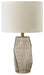 Details Made of glass with drum hardback fabric shade, Transparent gray finish, 3-way switch, 1 E26 socket, type A bulb recommended (not included); 100 watts max or LED equivalent; UL Listed, Assembly required