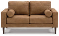 Small-scale style, tailored to perfection. This loveseat echoes retro aesthetics with warm caramel faux leather, while its ultra-linear silhouette incorporates a contemporary edge. Versatile in form and function, the seat suits styles from modern boho to transitional. And its size helps you to confidently curate your compact space without sacrificing comfort (or your budget).