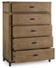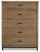Details Made with hardwood solids, mango wood veneer, MDF substrates and metal, Light brown wood-tone finish, Gunmetal gray finish on metal legs, Metal bar pulls, 5 drawers with fully finished interior, dovetail construction and heavy duty ball-bearing side glides (top drawer felt lined)